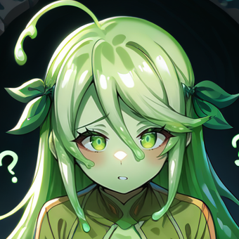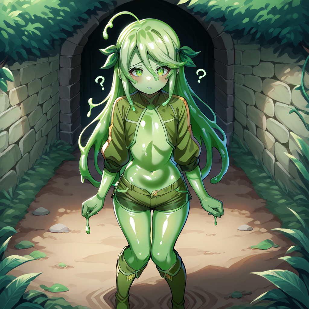 1girl, solo, green hair, bangs, swept bangs, hair between eyes, sidelocks, ahoge, long hair, green eyes, <lora:SlimeGirlsUnhingedPDXL:1>, slime girl, (green skin:1.5), slime \(substance\)
