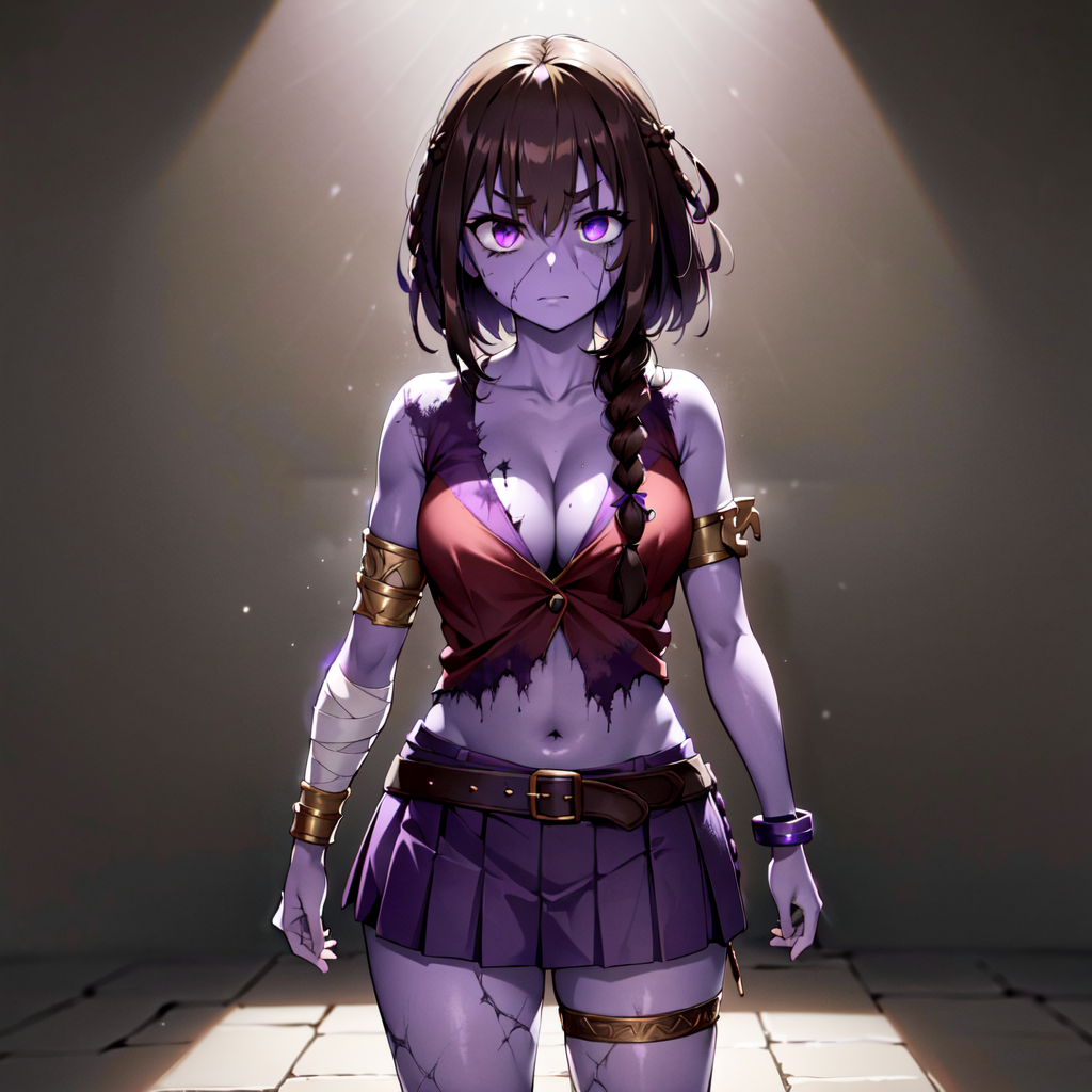 1girl, solo, dark brown hair, hair between eyes, swept bangs, sidelocks, short hair, braid, single braid, front braid, purple eyes, glowing eyes, (rotting, purple skin, zombie:1.2)