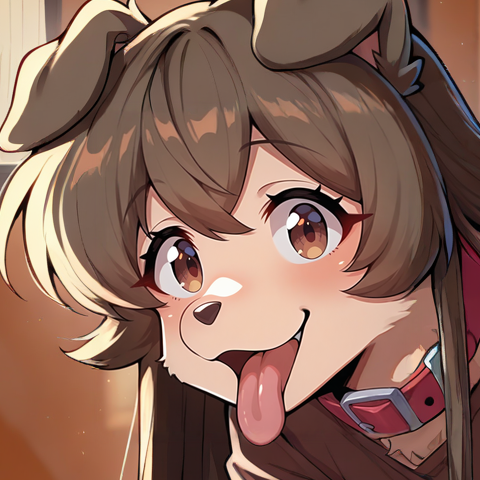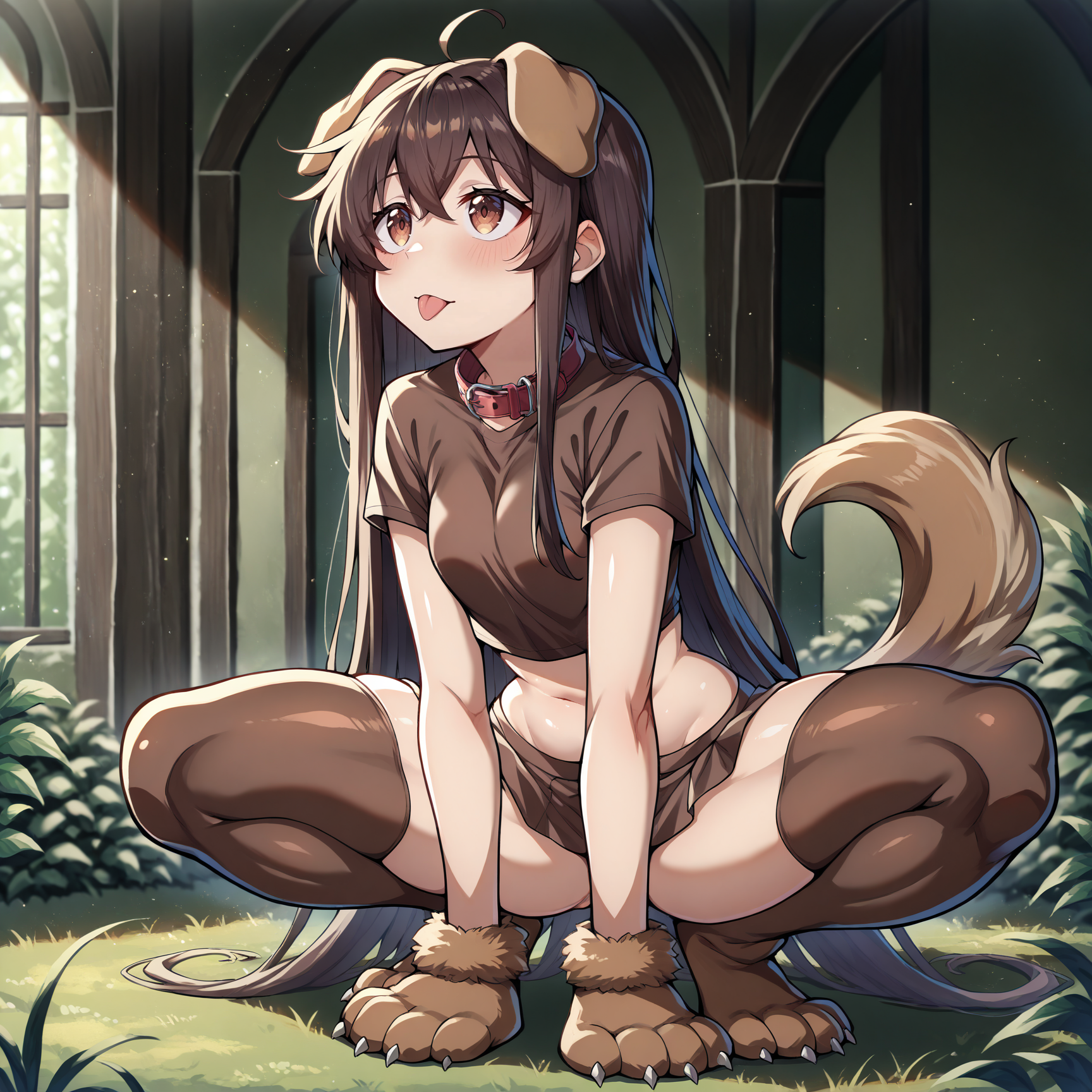 Physical Prompts 1girl, solo, dark brown hair, long hair, straight hair, ahoge, disheveled hair, dog ears, dog tail, brown eyes