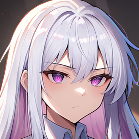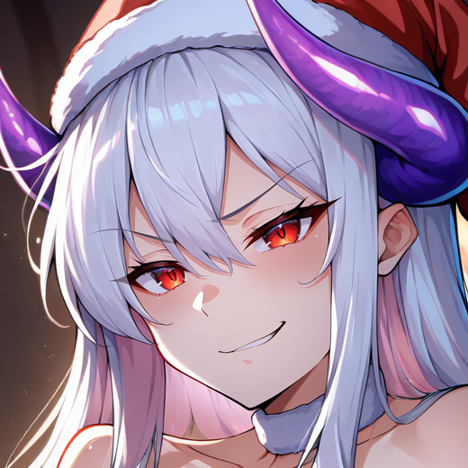 1girl, solo, white hair, hair between eyes, long hair, sidelocks, purple horns, red eyes, vampire