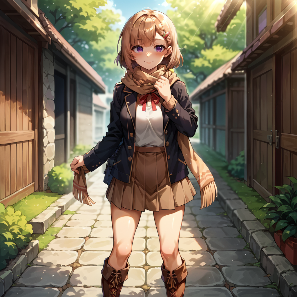 red hair ribbon, brown scarf, brown sweater, red neck ribbon, black jacket, brown skirt, brown boots, knee boots