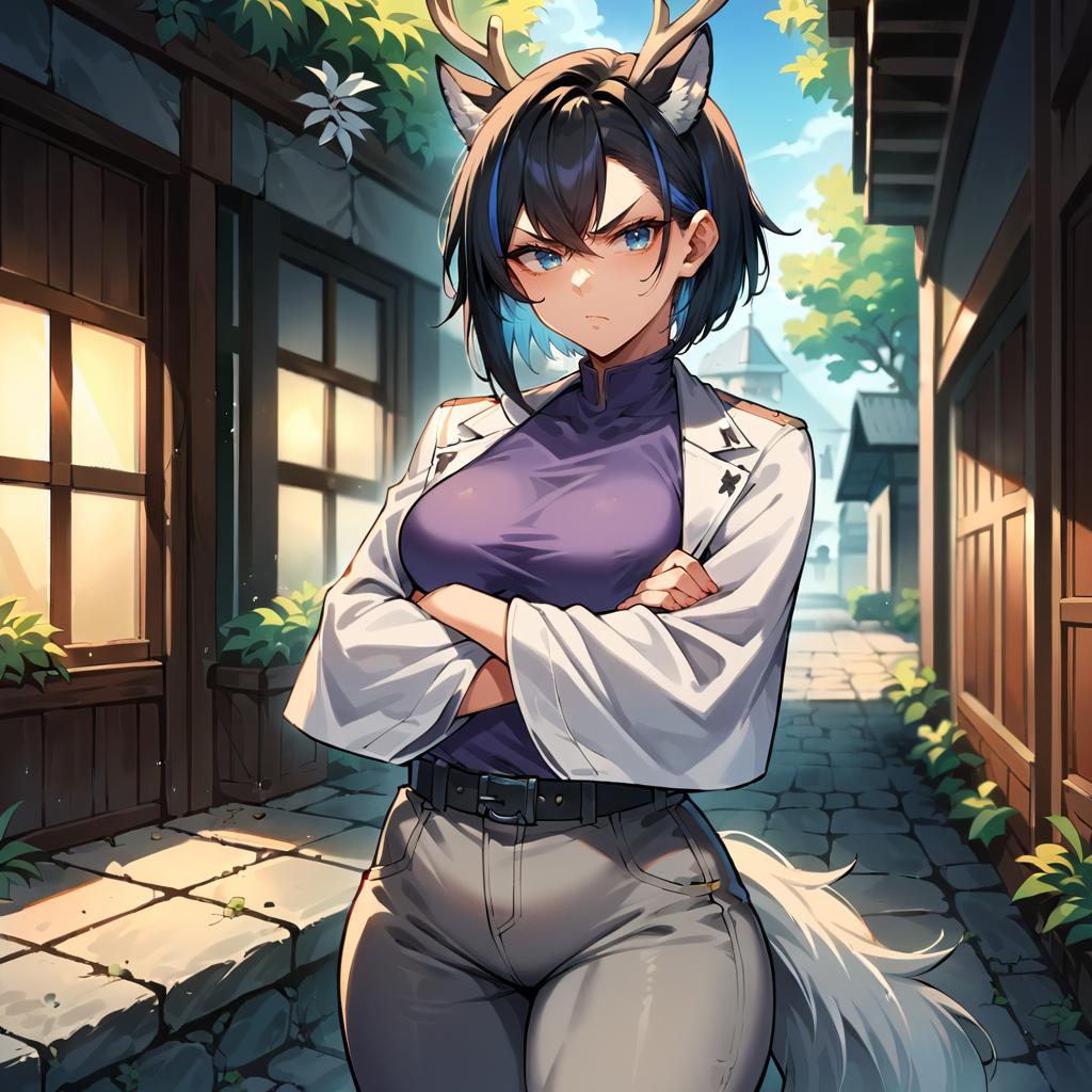 1girl, solo, black hair, medium hair, hair between eyes, swept bangs, bangs, square cut, light blue eyes, deer antlers, white wolf paws, white wolf ears, white wolf tail