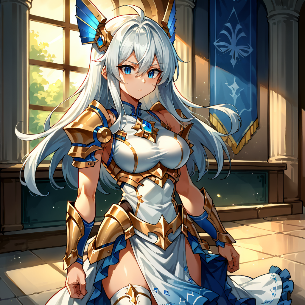 headgear, white dress, blue frills, frilled dress, white loincloth, slit dress, gold trim, white thighhighs, armored boots, armored dress, blue stole