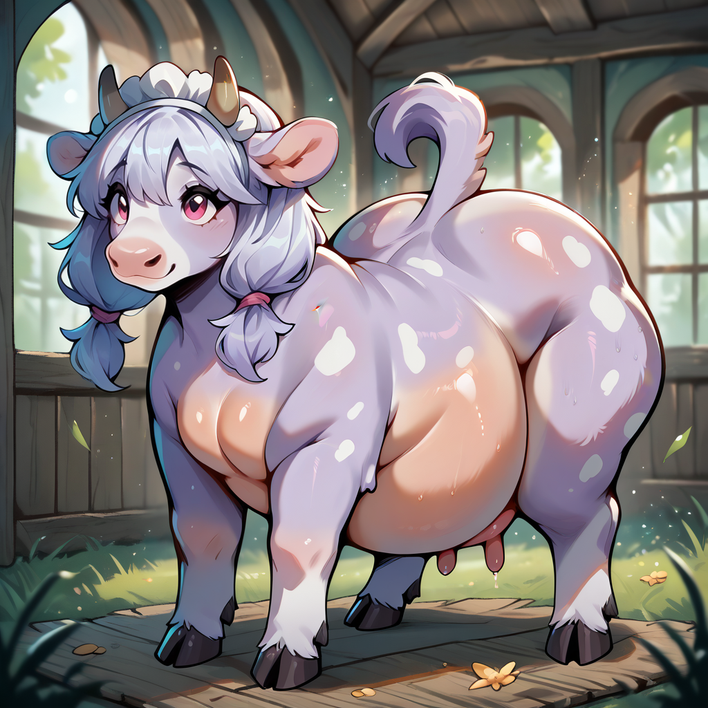 1girl, solo, source furry, light purple hair, twintails, pink eyes, vampire, hucow, furry, transformation, animalization, <lora:ToraFurry_XL_PonyV6_Pear_p1-t1:1>, white spots, light purple fur, furry female, anthro, ushimimi, (cow, hooves, udder:1.2), no nipples, no humans, hands on ground, cow limbs, cow muzzle, cow girl, cow horns, cow tail, standing, all fours