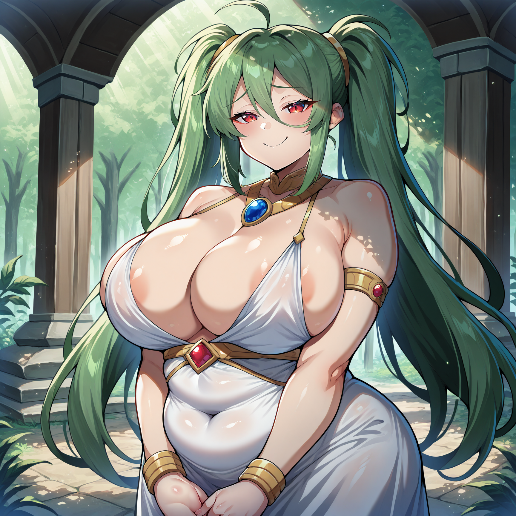 (forehead blue jewel:1.1), gold hair tie, white dress, gold trim, necklace, gold bracelets, gold armband, gold necklace, gold collar, jewelry, covered navel, areola slip, high-waist sideboob, cleavage, (blue gemstone:1.3)