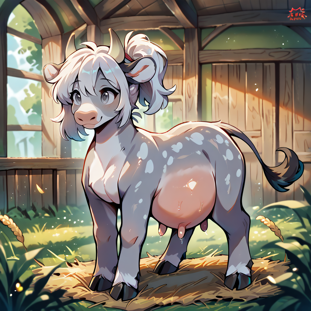 Cow Outfit : 1girl, solo, white hair, grey eyes, side ponytail, hucow, furry, transformation, animalization, <lora:ToraFurry_XL_PonyV6_Pear_p1-t1:1>, white spots, grey fur, furry female, anthro, ushimimi, (cow, hooves, udder:1.2), no nipples, no humans, hands on ground, cow limbs, cow muzzle, cow girl, cow horns, cow tail, standing, all fours