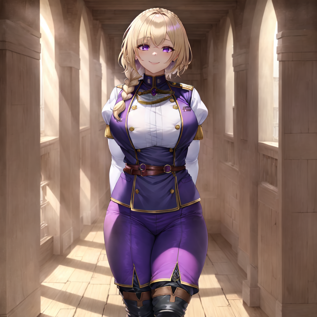 1girl, solo, light blonde hair, short hair, (braided hair, braid, front braid, single braid:1.2), swept bangs, purple eyes