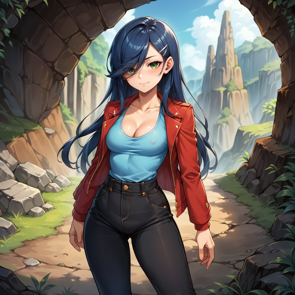 1girl, solo, dark blue hair, swept bangs, hair between eyes, white hairclip, single sidelock, hair over one eye, long hair, green eyes