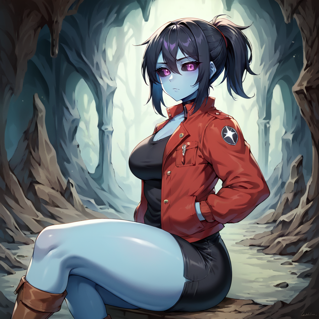 1girl, solo, black hair, swept bangs, hair between eyes, single sidelock, ponytail, medium hair, (blue skin:1.5), black sclera, purple eyes