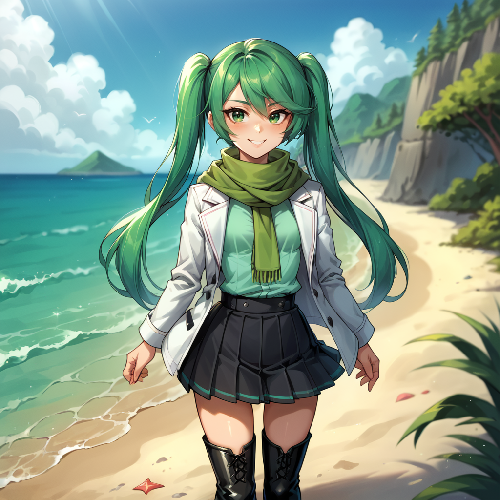 green scarf, white jacket, green shirt, black skirt, pleated skirt, black boots, thigh boots