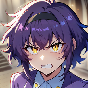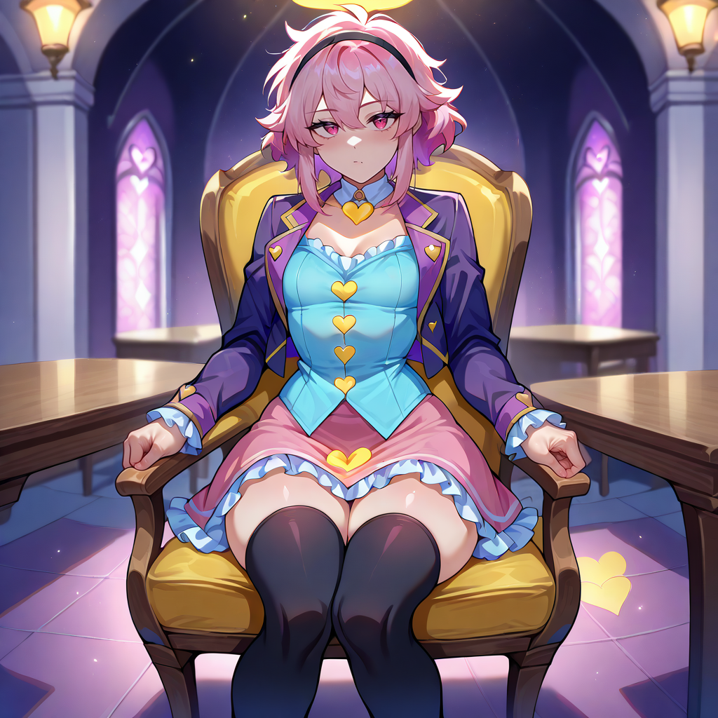 black hairband, yellow heart, white collar, purple jacket, light blue shirt, yellow buttons, heart button, long sleeves, white frills, frilled sleeves, pink skirt, frilled skirt, black thighhighs, red shoes