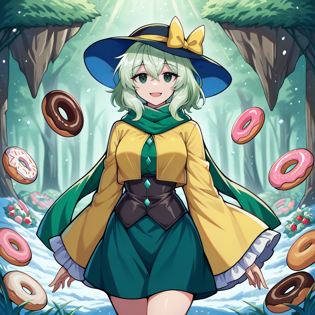 wide brim, cloche hat, black hat, hat bow, yellow bow, hat ribbon, yellow ribbon, yellow jacket, green shirt, diamond button, frilled sleeves, wide sleeves, green scarf, black corset, green skirt, miniskirt, black frills, black boots