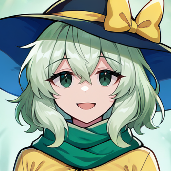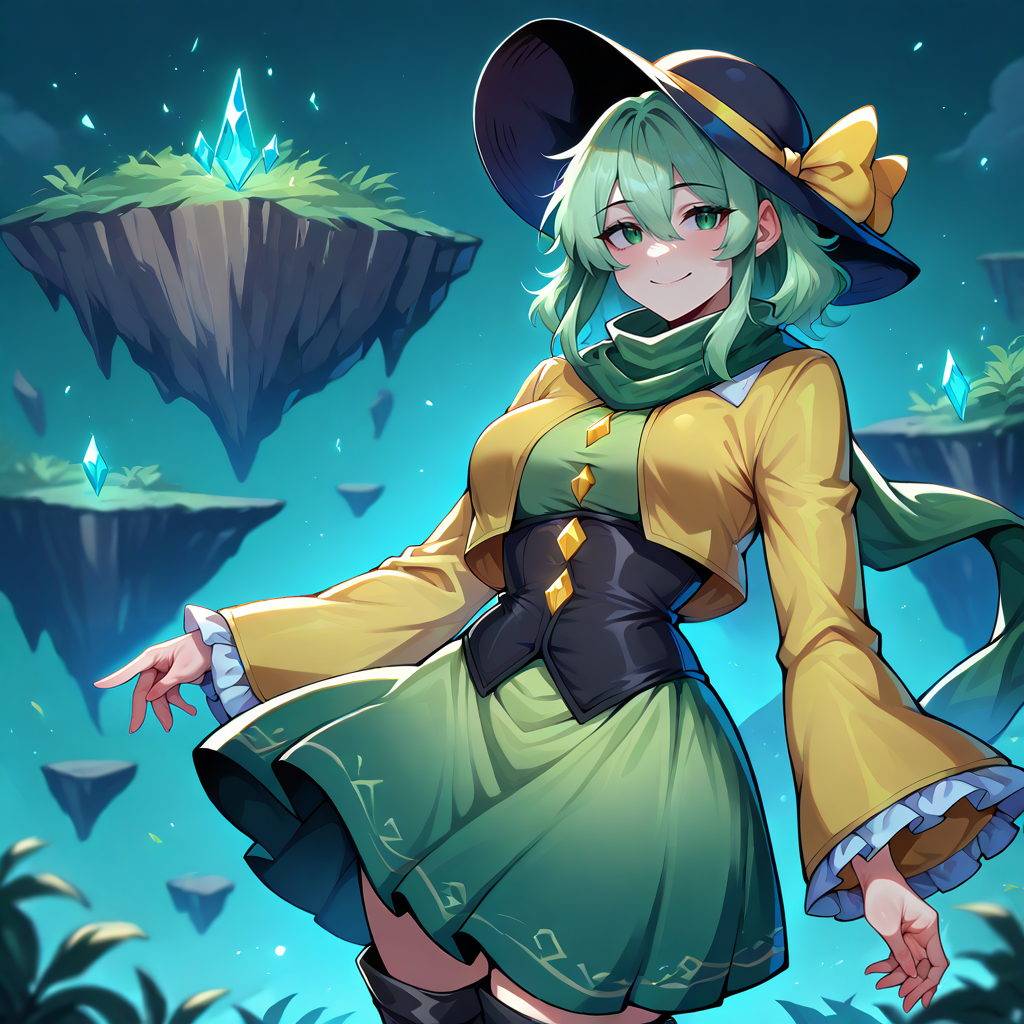 wide brim, cloche hat, black hat, hat bow, yellow bow, hat ribbon, yellow ribbon, yellow jacket, green shirt, diamond button, frilled sleeves, wide sleeves, green scarf, black corset, green skirt, miniskirt, black frills, black boots