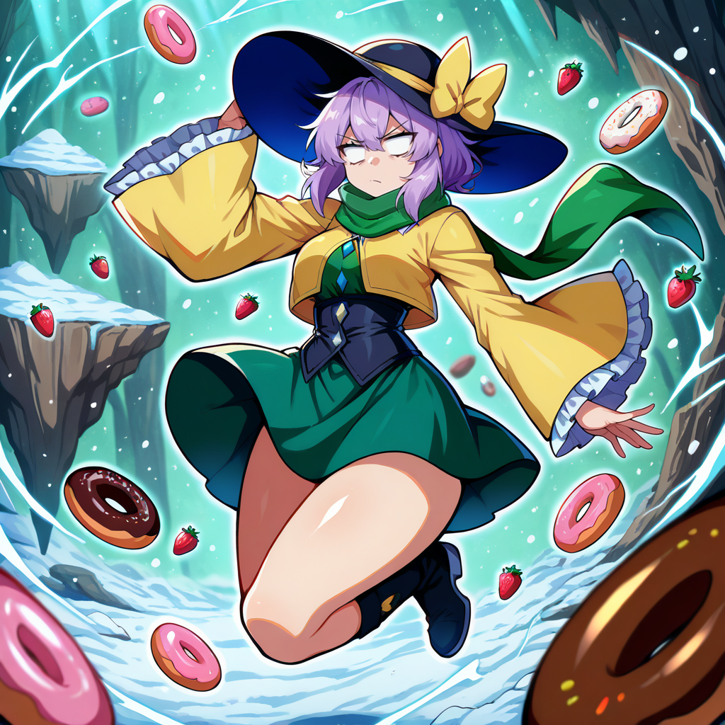 wide brim, cloche hat, black hat, hat bow, yellow bow, hat ribbon, yellow ribbon, yellow jacket, green shirt, diamond button, frilled sleeves, wide sleeves, green scarf, black corset, green skirt, miniskirt, black frills, black boots
