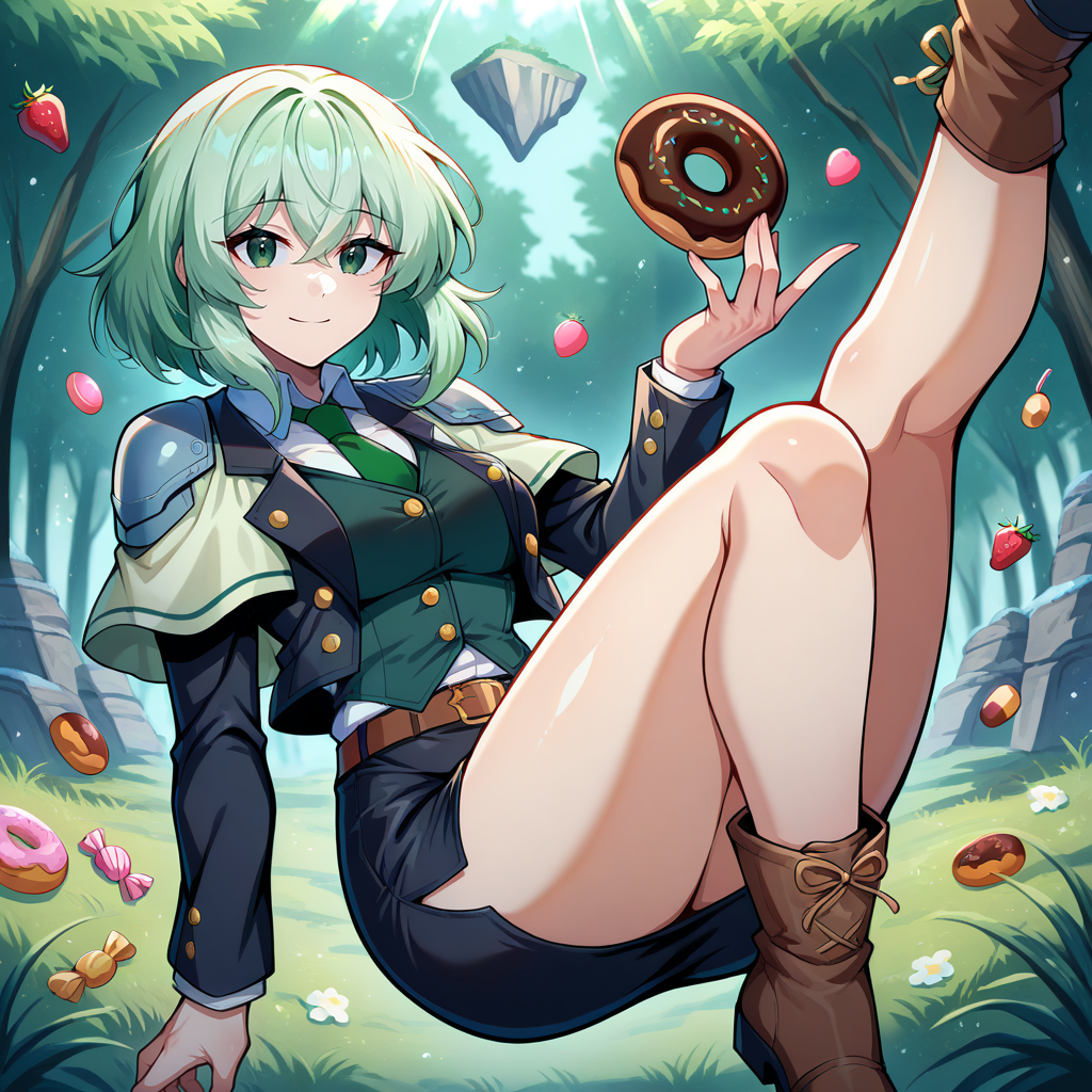black jacket, short jacket, dark green vest, grey shoulder plates, gold buttons, brown belt, long sleeves, open jacket, white shirt, collared shirt, long sleeves, green capelet, half capelet, black sleeves, black skirt, plaid skirt, office lady, tight clothes, brown boots, green tie