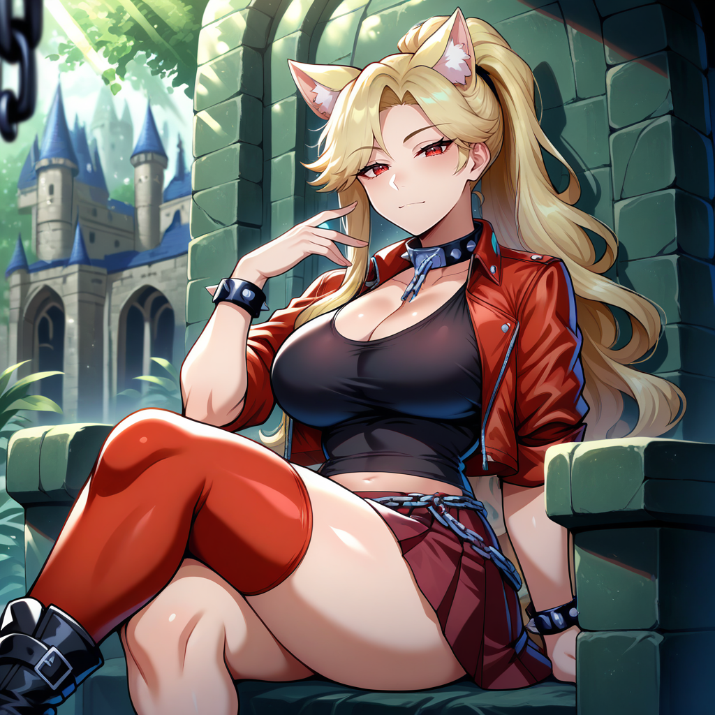 black tank top, cleavage, red jacket, sleeve rolled up, spiked collar, spiked bracelet, bling, dark red skirt, pleated skirt, red thighhigh, (single thighhigh:1.2), black boots, chain, chain belt, midriff peek
