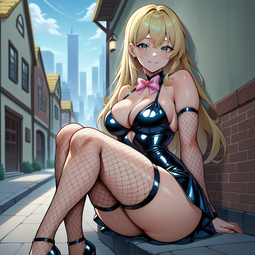 Outfit Prompts latex dress, sleeveless, cleavage, fishnet sleeves, fishnet thighhighs, bowtie, pink bowtie, short dress, latex high heels