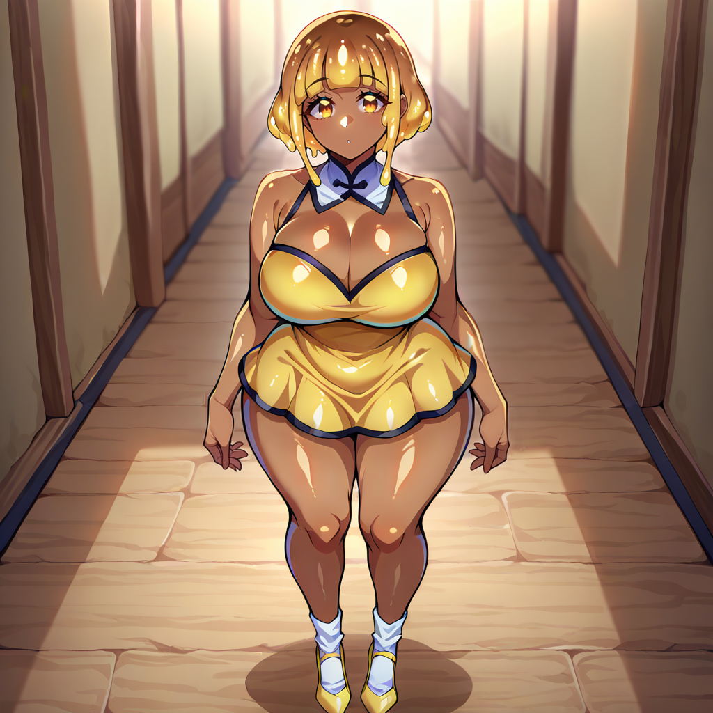 Physical Prompts 1girl, solo, caramel hair, short hair, square cut, blunt bangs, sidelocks, caramel eyes, asian, <lora:SlimeGirlsUnhingedPDXL:1>, slime girl, slime \(substance\), (brown skin:1.2)