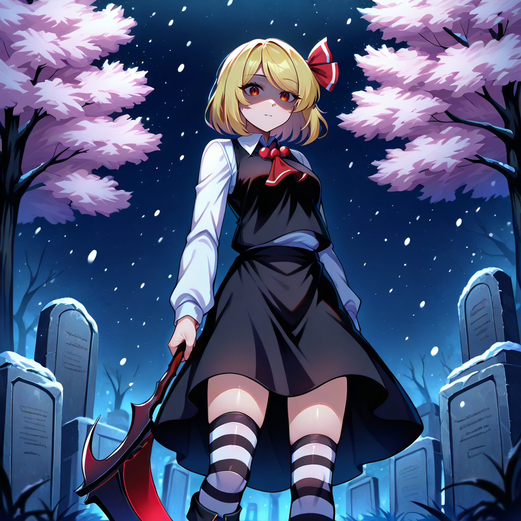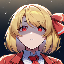 1girl, solo, rumia, ex-rumia, blonde hair, short hair, swept bangs, medium hair, red eyes