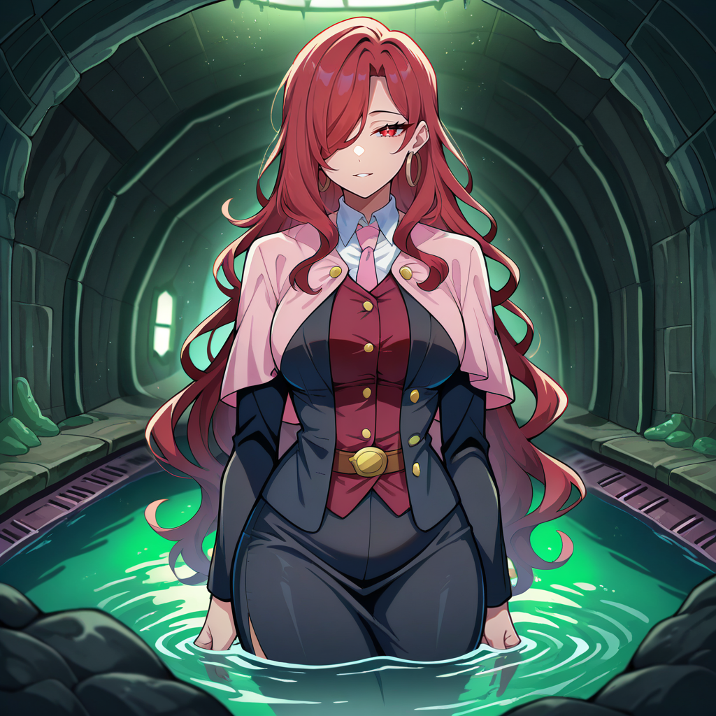1girl, solo, red hair, very long hair, sidelocks, hair over one eye, disheveled, wavy hair, red eyes, mature female