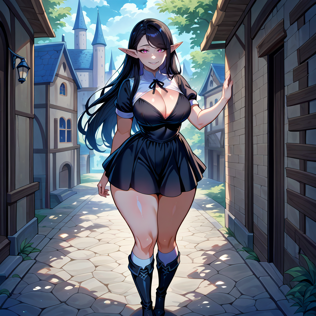 1girl, solo, black hair, swept bangs, single sidelock, forehead, long hair, elf, pointy ears, pink eyes