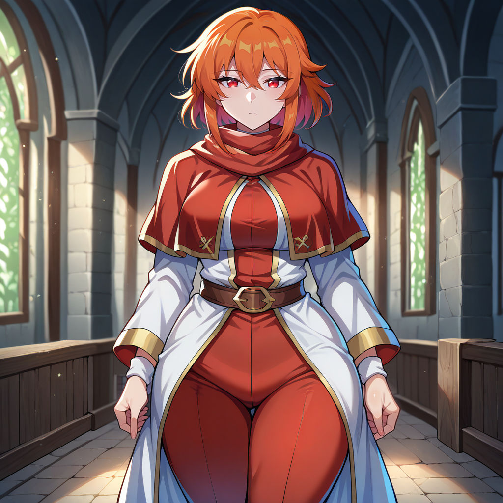 Outfit Prompts red shirt, white coat, long coat, gold trim, white wristband, red pants, brown boots, medieval, robe, red capelet, brown belt, red scarf