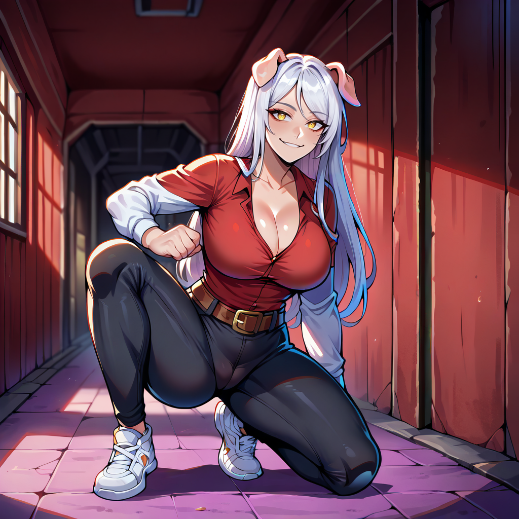 red shirt, long sleeves, white sleeves, cleavage, brown belt, black pants, white shoes