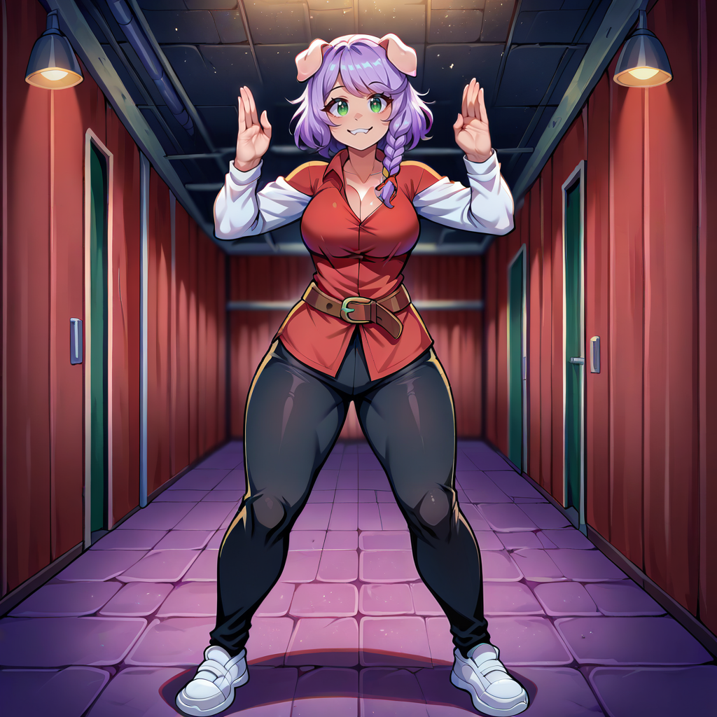 1girl, solo, purple hair, square cut, medium hair, single braid, front braid, green eyes, pig ears, pig girl, android, sharp teeth