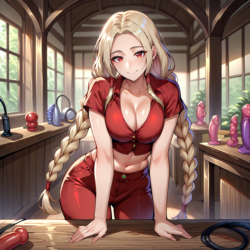 red shirt, midriff, short sleeves, cleavage, dark red pants, red boots
