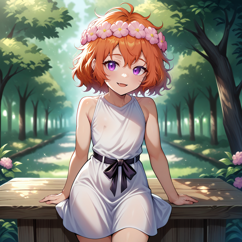 Physical Prompts 1girl, solo, orange hair, hair between eyes, short hair, messy hair, disheveled, purple eyes
