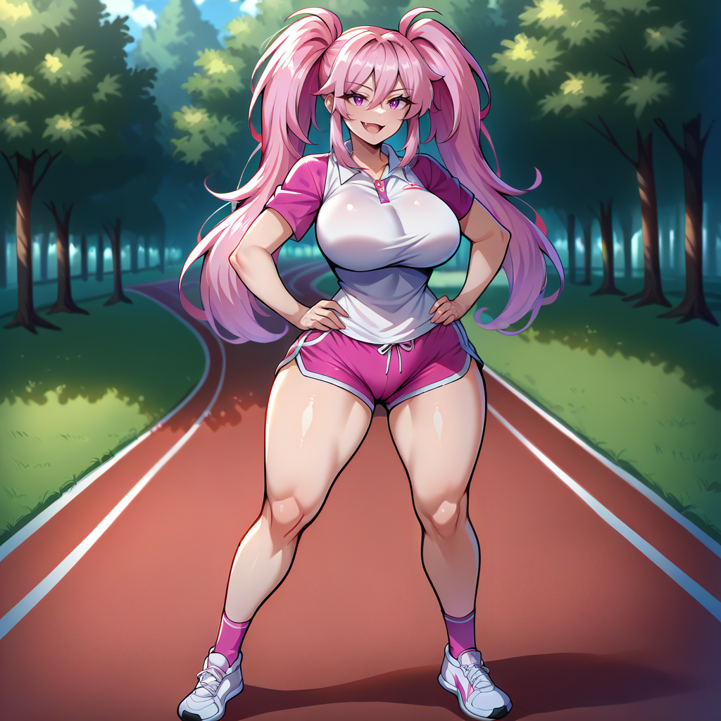 Outfit Prompts waitress, sportswear, white tank top, magenta sleeves, short sleeves, collared shirt, magenta shorts, dolphin shorts, short shorts, magenta socks, ankle socks, white shoes