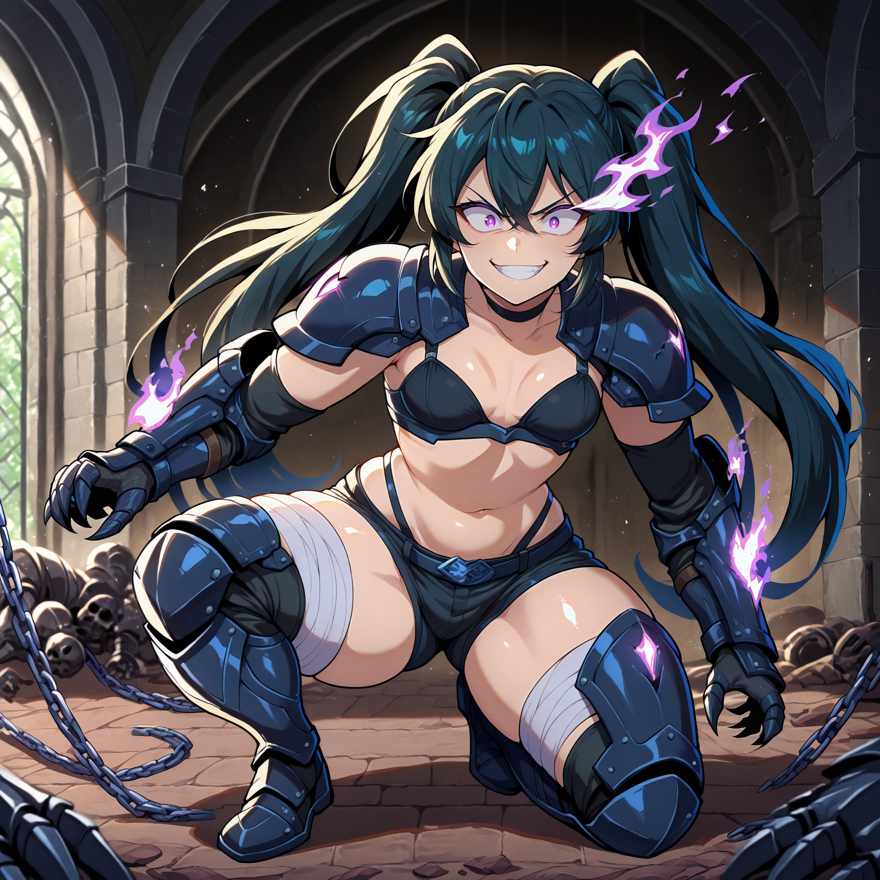 Outfit Prompts chained, black bra, black choker, short shorts, black shorts, heavy armor, black armor, armored gloves, black claws, arm armor, armored boots, thigh boots, black boots, bandaged leg, goddess, death