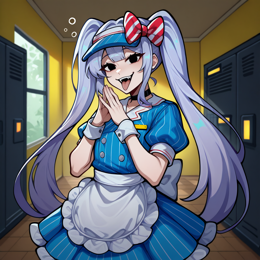 Physical Prompts 1girl, solo, mesmerizermiku, <lora:vocaloid_mesmerizermiku_ponyXL:1>, light purple hair, twintails, vampire, black eyes, empty eyes, sharp teeth, tongue out