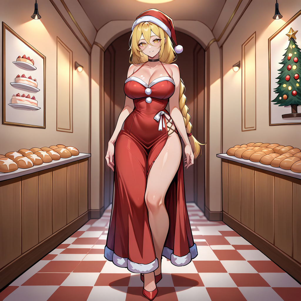 Outfit Prompts santa costume, santa hat, red dress, sleeveless dress, slit dress, dress straps, long dress, pleated dress, red high heels, santa boots