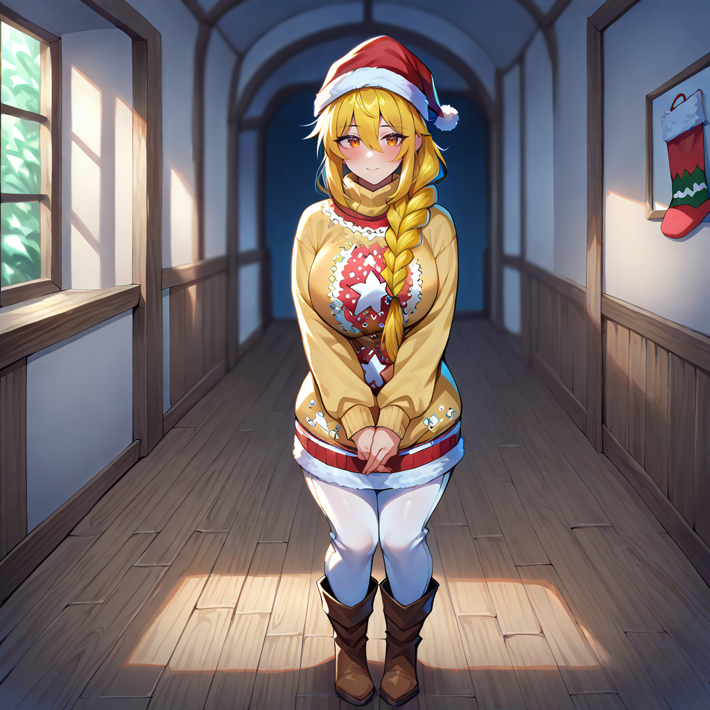 Outfit Prompts santa hat, (yellow sweater:1.2), white pants, brown boots