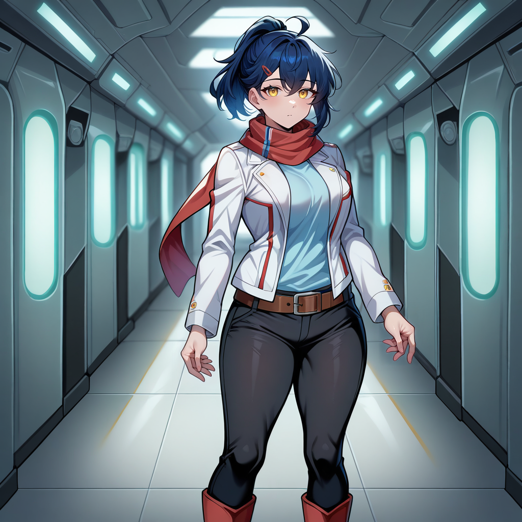 1girl, solo, yellow eyes, dark blue hair, hairclip, medium hair, bangs, ahoge, ponytail, short ponytail, high ponytail