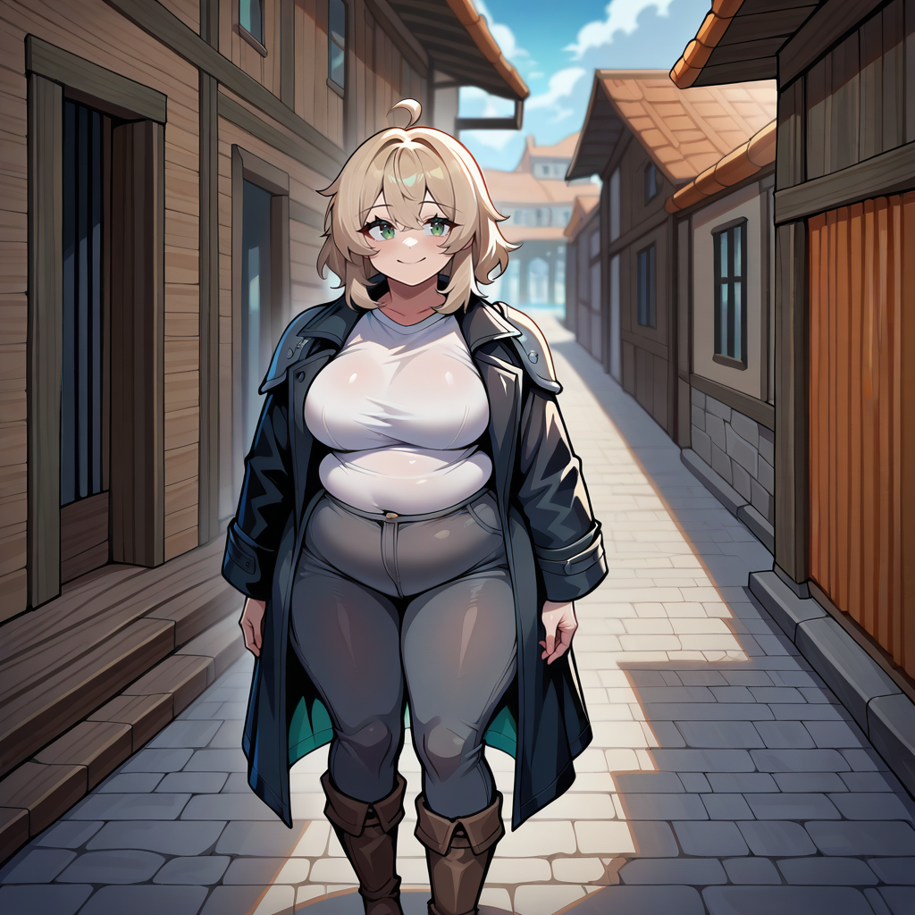 Outfit Prompts black coat, white fur shoulder pads, white shirt, dark gray pants, brown boots