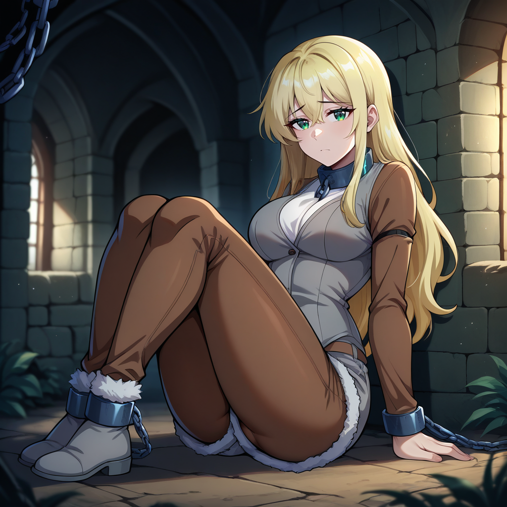 Outfit Prompts slave, white shirt, grey vest, white fur, fur trim, brown sleeves, brown pants, grey shorts, pants under shorts, grey boots, chained wrists, chained legs