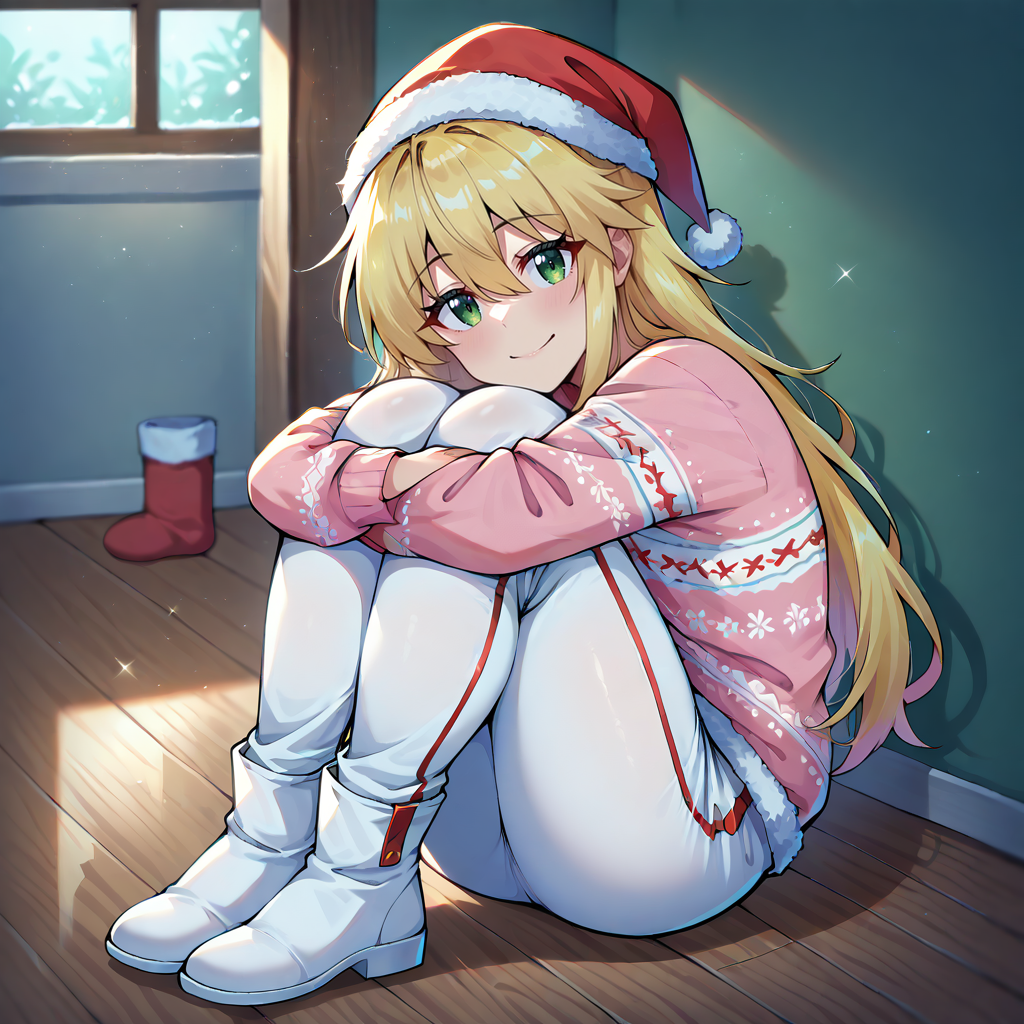 Outfit Prompts pink sweater, white pants, white boots, santa hat, christmas sweater, christmas stocking, white trim, fur trim