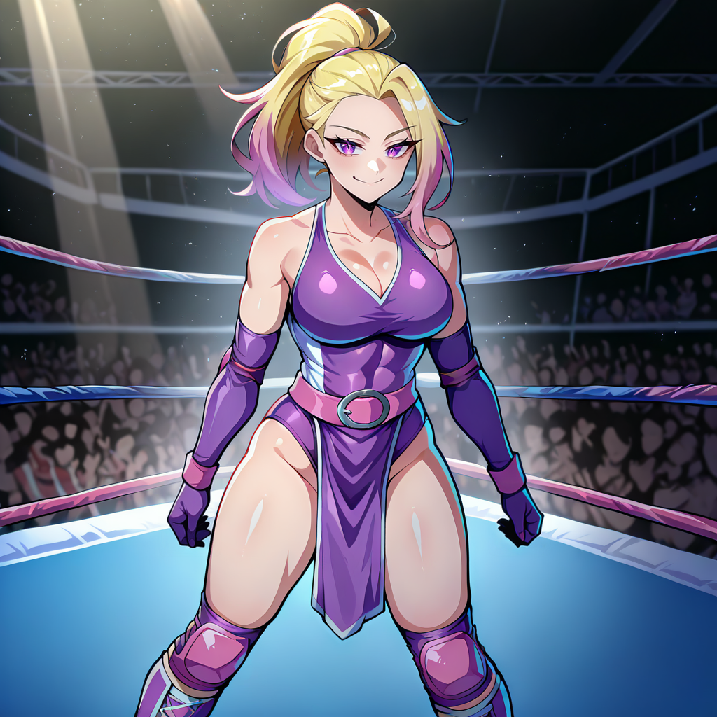 purple shirt, tight clothes, wrestling outfit, wrestler, sleeveless, cleavage, purple gloves, elbow gloves, dark magenta belt, dark magenta pelvic curtain, purple shorts, purple boots, knee boots, knee pads, elbow pads