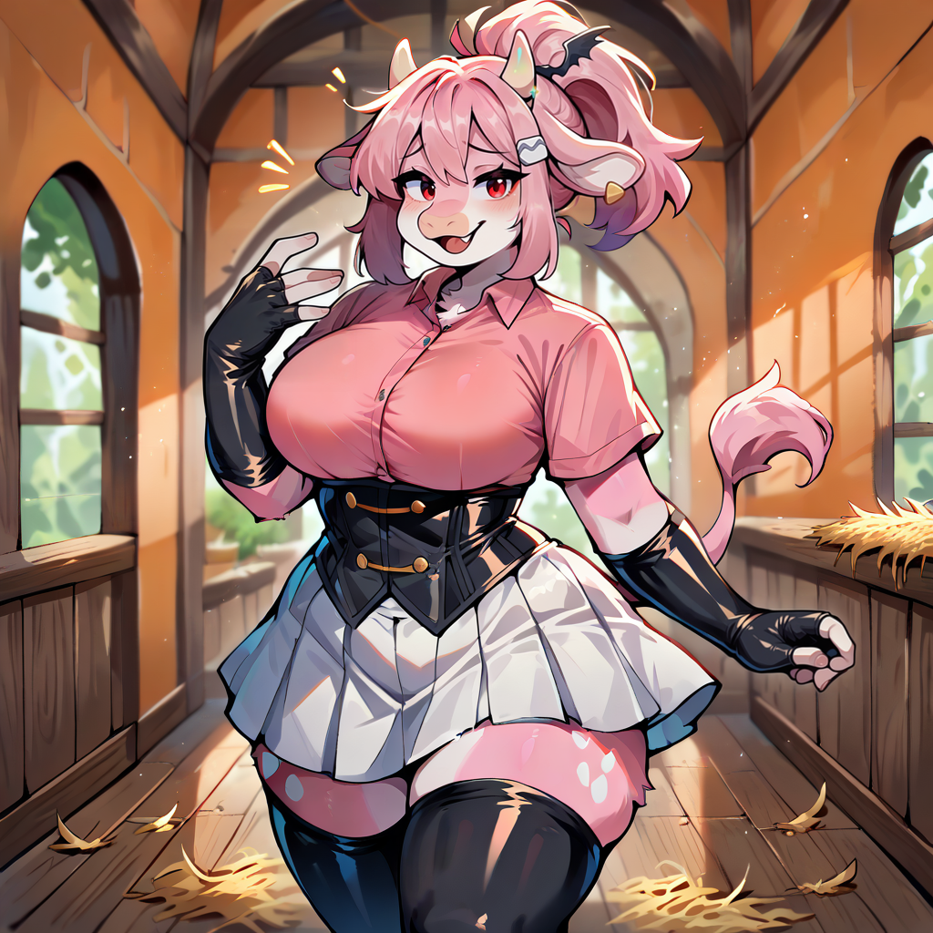 1girl, solo, source furry, pink hair, ponytail, disheveled hair, red eyes, vampire, skin fang, cute fangs, hucow, furry, transformation, animalization, <lora:ToraFurry_XL_PonyV6_Pear_p1-t1:1>, white spots, pink fur, furry female, anthro, ushimimi, cow limbs, cow muzzle, cow, hooves, udder, cow girl, cow horns, cow tail