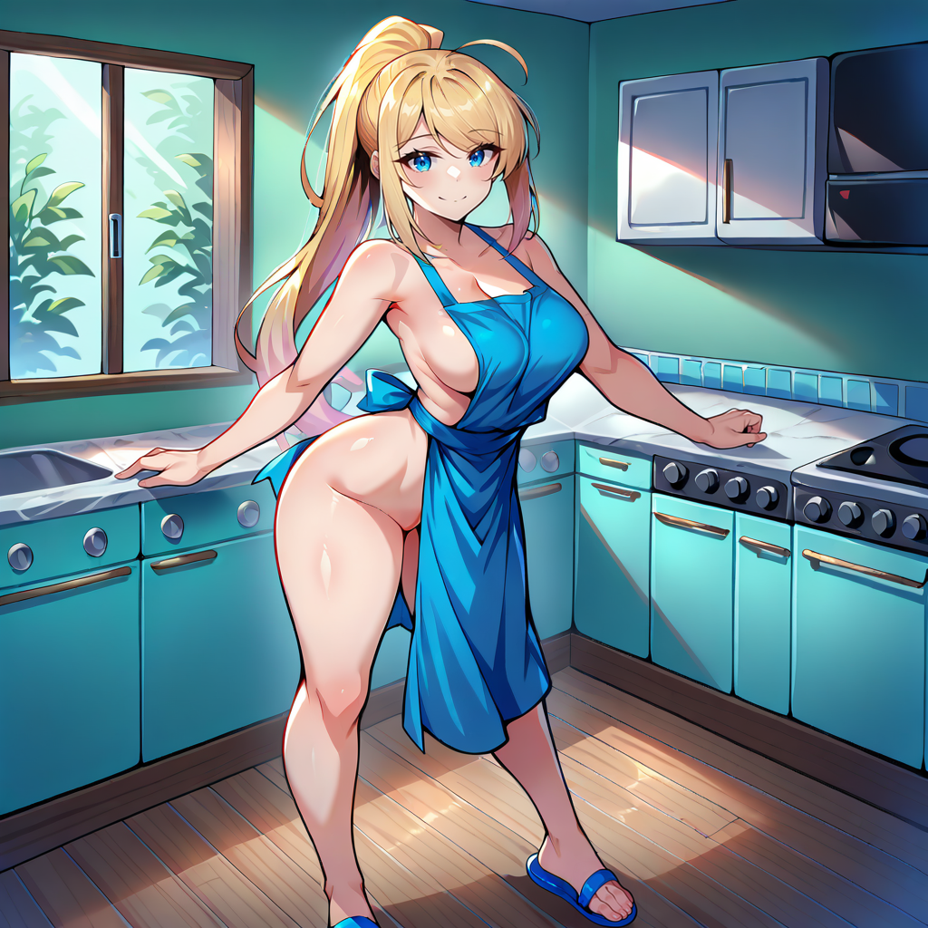 Outfit Prompts (mysterious heroine x /(fate grand order/):0.4), blue apron, naked apron, nude, no panties, no bra, blue sandals