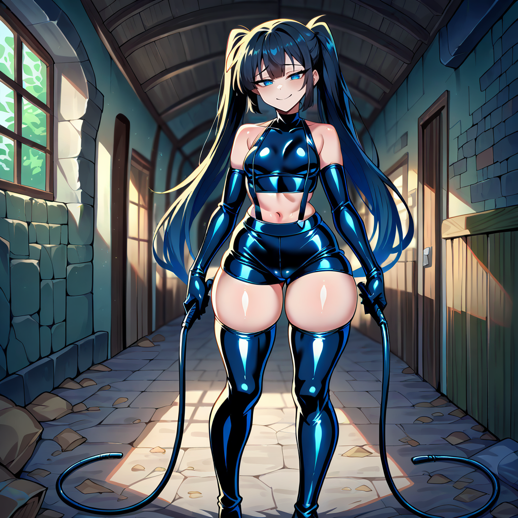 Outfit Prompts latex tank top, latex gloves, elbow gloves, sleeveless, latex vest, latex shorts, suspenders, latex thighhighs, latex boots
