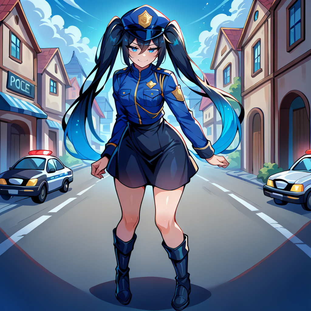Outfit Prompts police uniform, blue jacket, blue hat, black boots, black skirt