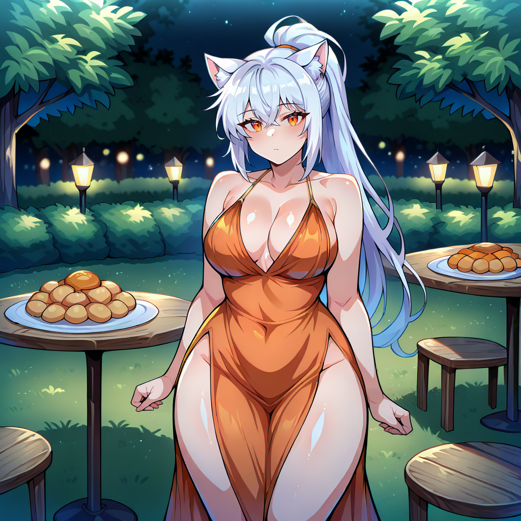 Physical Prompts 1girl, solo, white hair, long hair, ponytail, bangs, hair between eyes, white cat ears, orange eyes, futanari, full-package futanari, penis