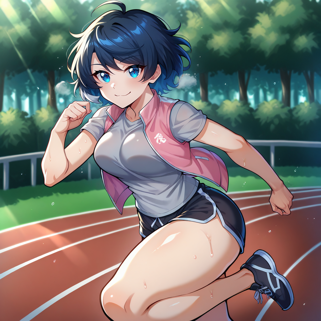 Physical Prompts 1girl, solo, black hair, short hair, messy hair, hair between eyes, swept bangs, bangs, ahoge, blue eyes