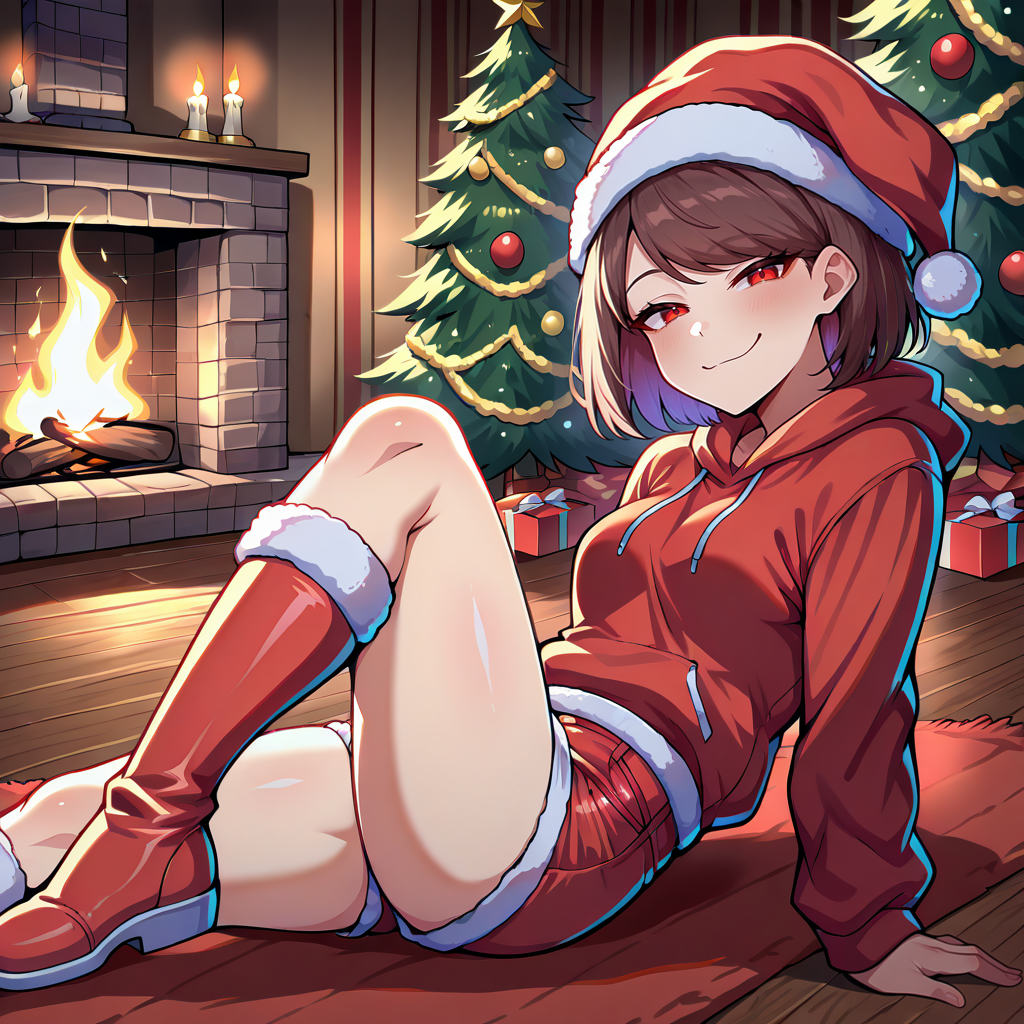 Outfit Prompts red hoodie, red shorts, denim shorts, red boots, knee boots, santa costume, santa hat, santa boots