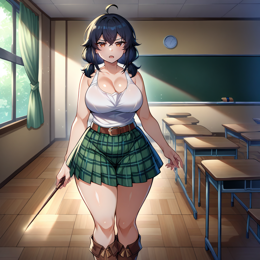 white tank top, sleeveless, cleavage, brown belt, green skirt, plaid skirt, brown boots