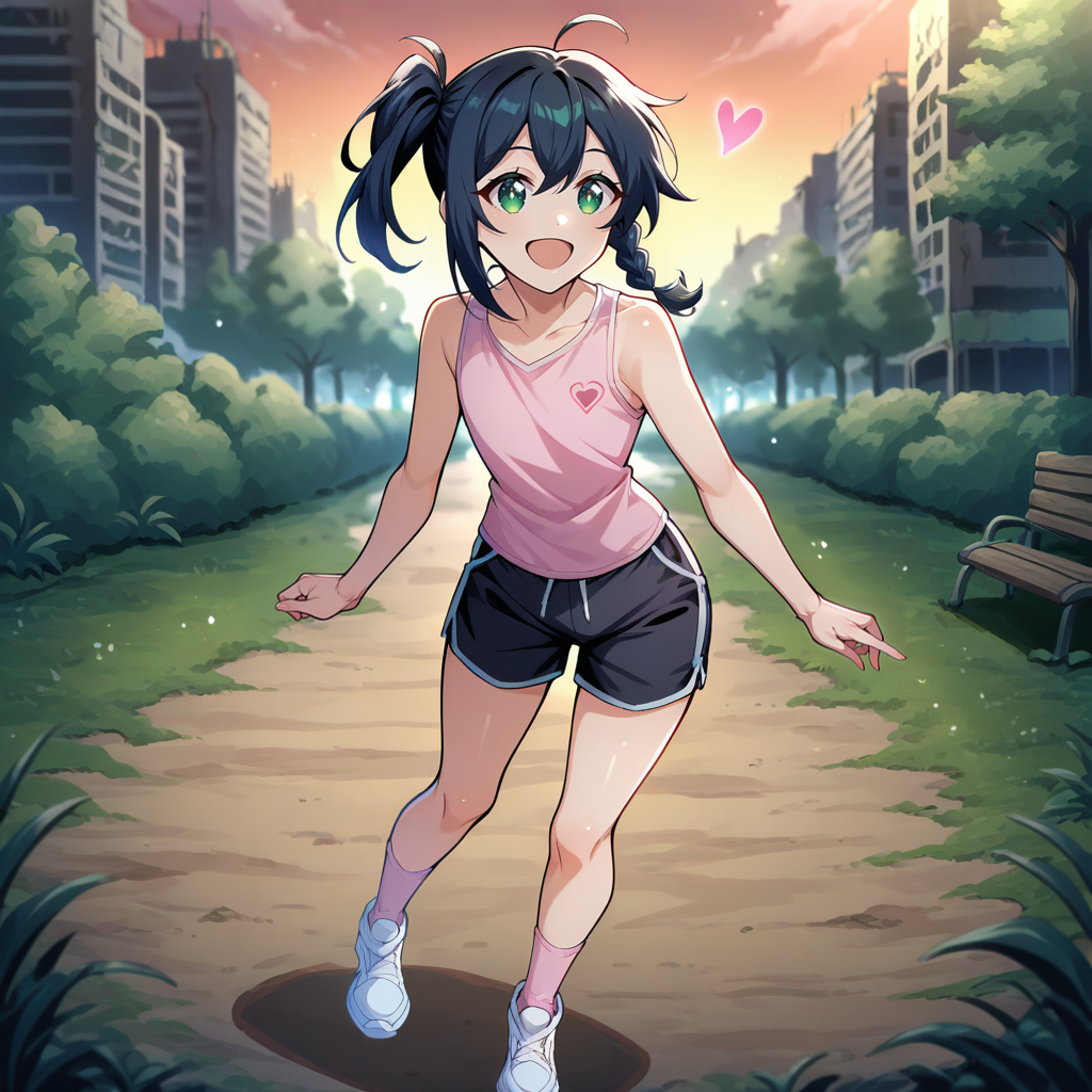 pink tank top, heart \(symbol\), sleeveless, black shorts, white shoes, pink socks