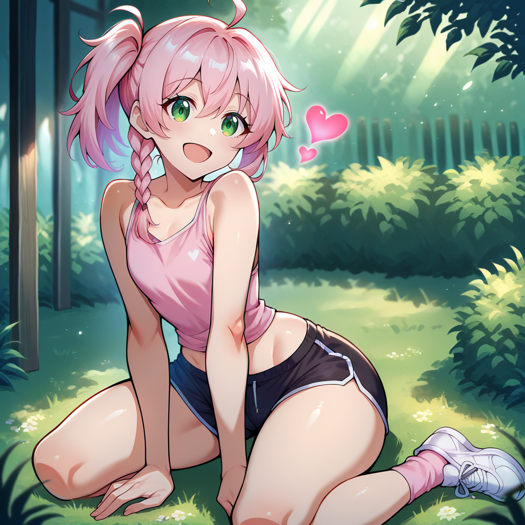 Outfit Prompts pink tank top, heart \(symbol\), sleeveless, black shorts, white shoes, pink socks